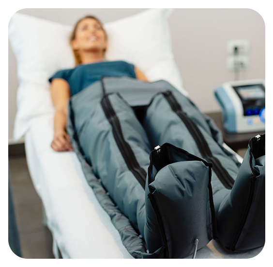 Στη συνέχεια, η πελάτισσα εισέρχεται στην πρεσσοθεραπεία, όπου η ρυθμική πίεση ενισχύει τη λεμφική παροχέτευση, επιταχύνοντας τα αποτελέσματα.